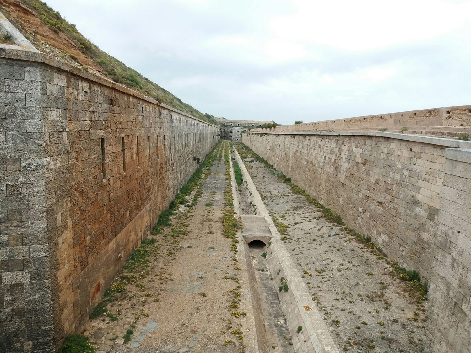 El foso, con más de 1500 m lineales, rodea por el exterior todo el frente defensivo, y está protegido tanto por las aspilleras y casamatas de la propia fortaleza como por los fortines de los entrantes 2 y 5.